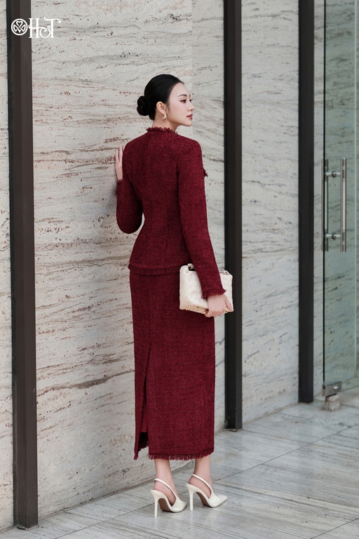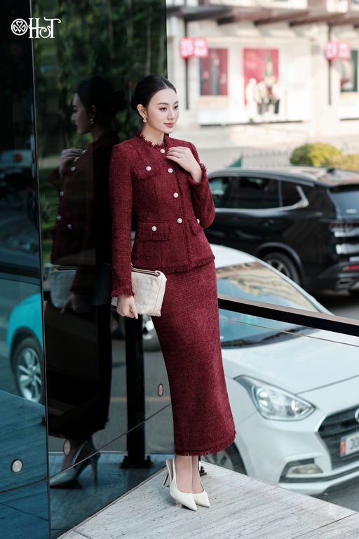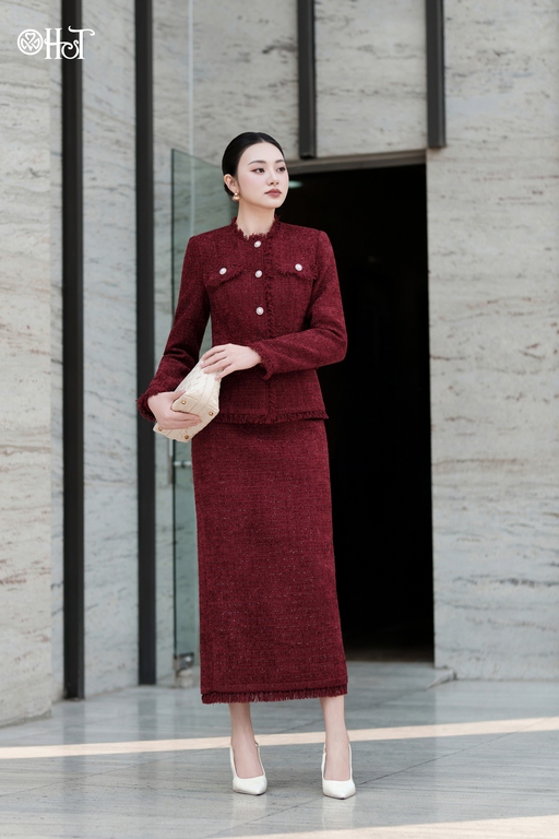 Vest Tweed cổ tròn 4 túi Đỏ